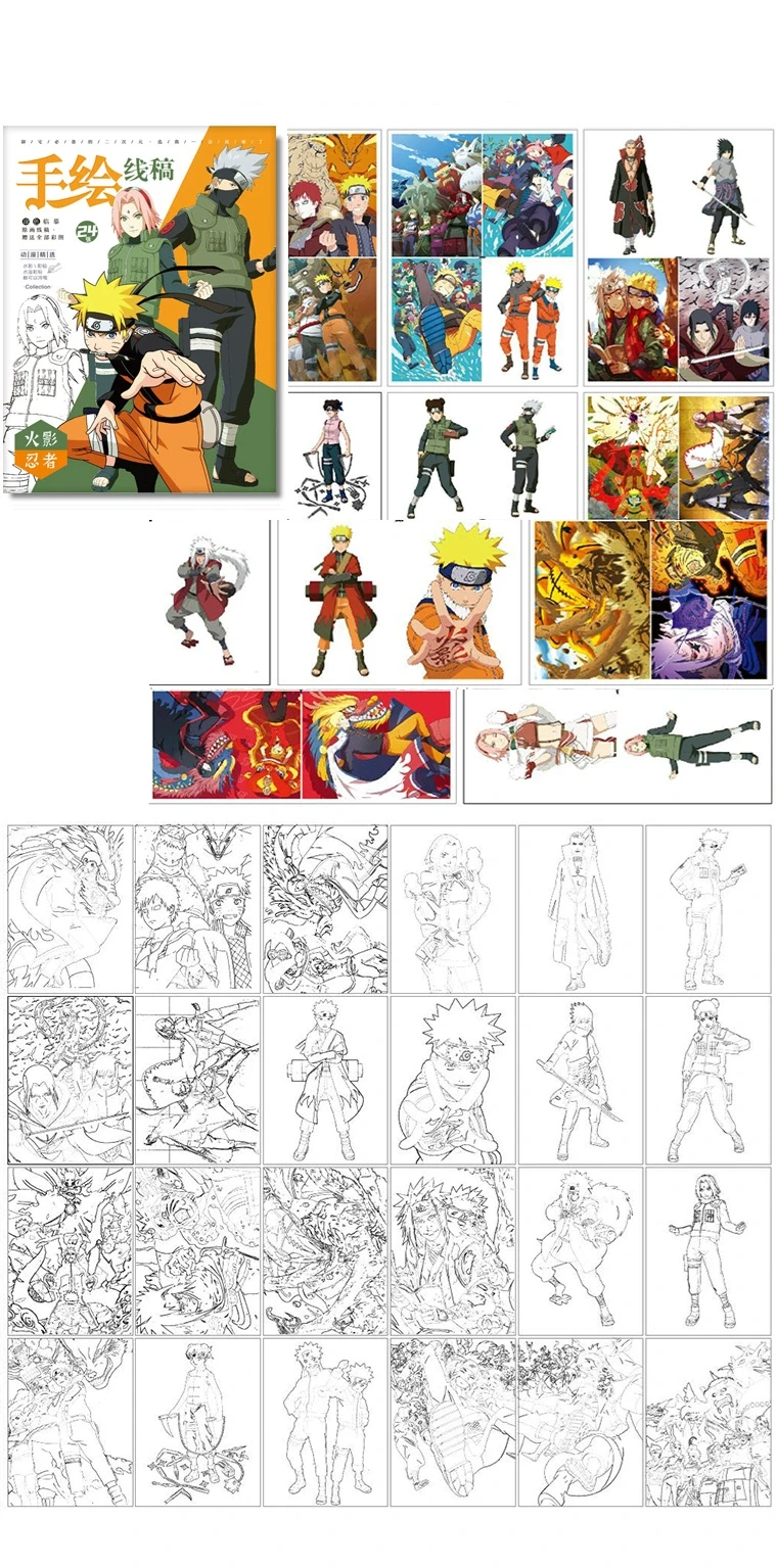Colección de láminas de Naruto para pintar: 24 bocetos para pintar + 24 imágenes a color