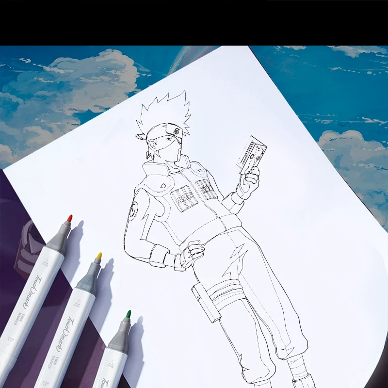 - Bocetos para pintar: La mitad de las láminas están diseñadas como bocetos en blanco y negro, listos para que añadas tu toque personal con tus colores favoritos. Estos bocetos proporcionan una excelente oportunidad para practicar técnicas de sombreado, mezcla de colores y expresión artística mientras te sumerges en el universo de Naruto para pintar.