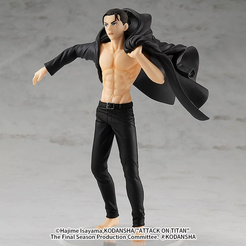 - Diseño dinámico: La pose dinámica de Eren, con el torso descubierto y una expresión determinada en su rostro, captura la intensidad y la fuerza del personaje en acción.