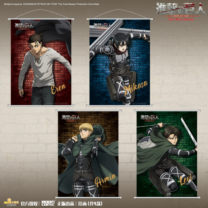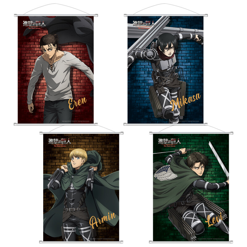- Representación fiel: Los pósteres muestran a Eren, Mikasa, Armin y Levi en arte detallado que refleja sus roles en la temporada final.
